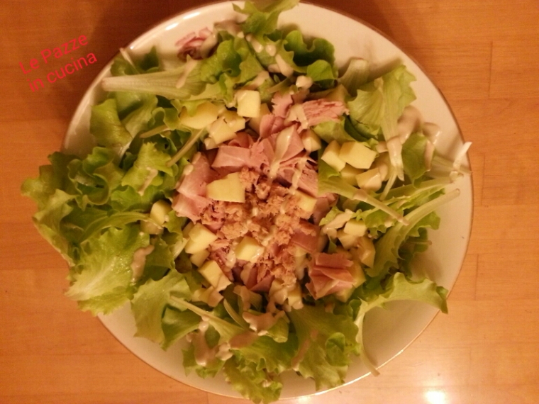 Lavare e asciugare l’insalata, condirla con sale, olio e aceto, aggiungere tutti gli ingredienti e mescolare.