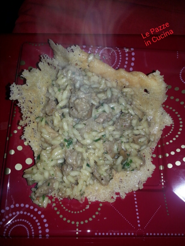 Risotto Salsiccia e Funghi in Cestini di parmigiano. Vi potrà sembrare una ricetta invernale, invece è buonissima anche a ferragosto!!