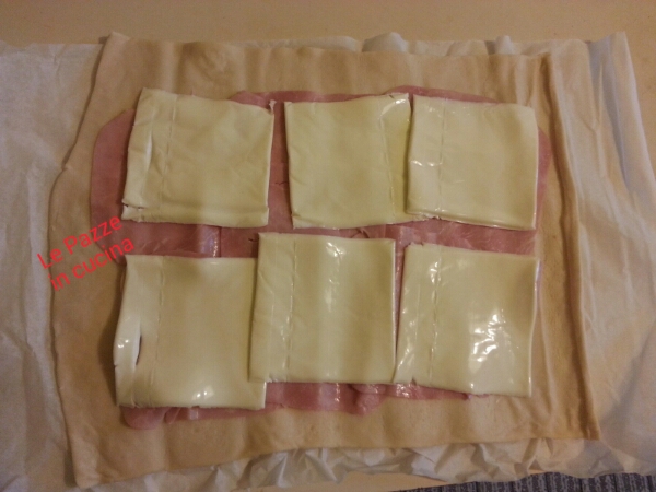 Srotolare la pasta della pizza direttamente sulla sua carta forno. Ricoprirla con il prosciutto e le sottilette e arrotolare.