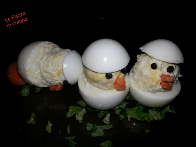 Fate cuocere le uova per renderle sode (8-10 minuti) poi fatele raffreddare. Una volta pronte, sgusciatele e tagliatela con delicatezza a metà e svuotatele. Da ogni metà superiore dell’albume tagliate la punta, che sarà il cappellino del pulcino, mentre quella inferiore fungerà da contenitore.