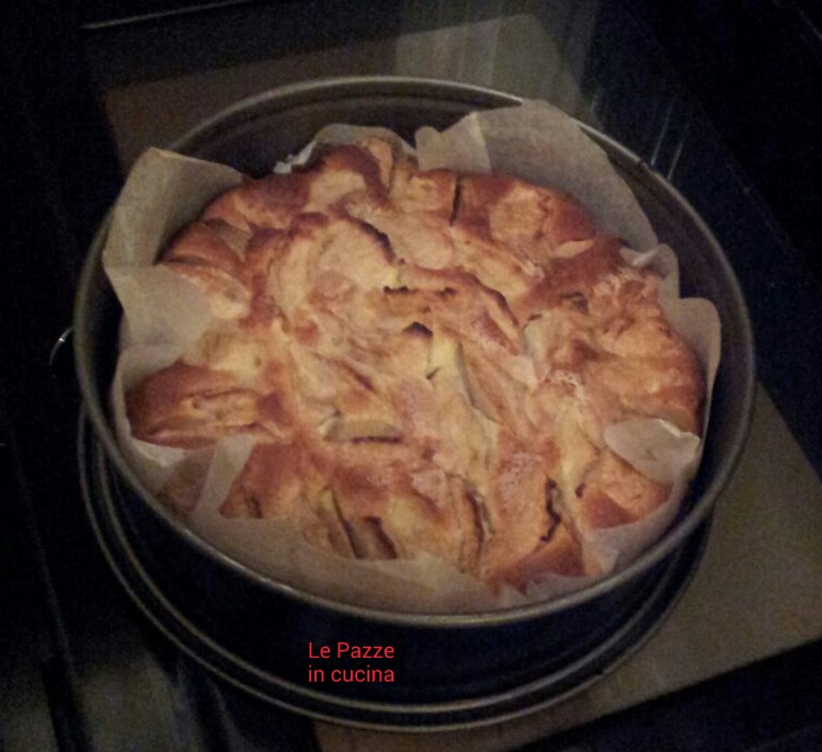 Piazzate tutto nella tortiera e mettete sopra le mele a spicchi. Se volete cospargete con un po’ di zucchero (di canna sarebbe meglio).