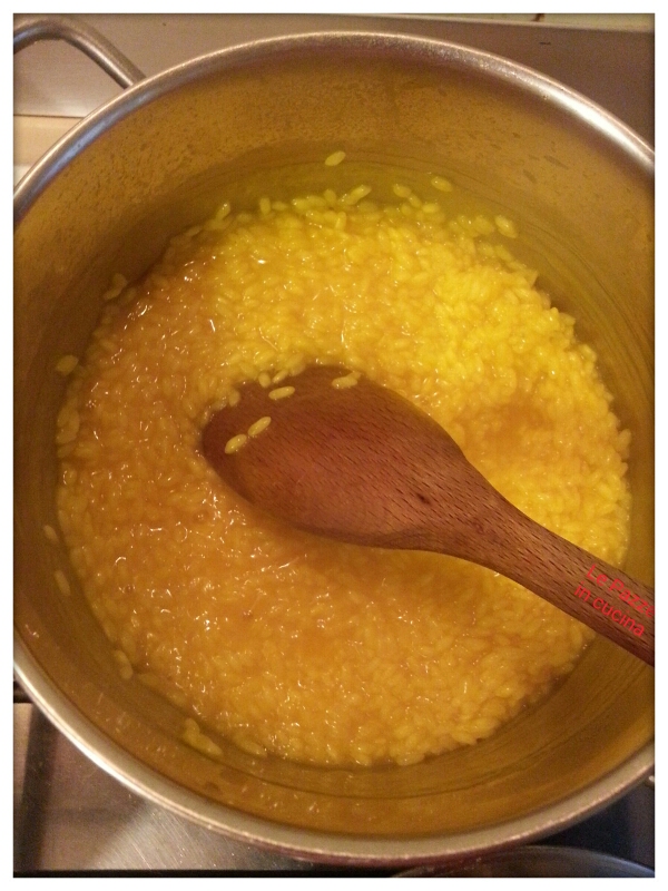 In una pentola fate soffriggere la cipolla tritata in un filo d’olio, dopo qualche minuto aggiungete il riso e fatelo tostare. Sfumate con il vino bianco, fate evaporare e aggiungete lo zafferano. Iniziate la cottura con il brodo, un paio di mestoli per iniziare, in quanto il riso, per cuocere, deve fare le bolle all’interno della pentola.