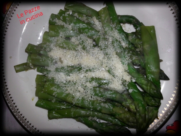 In un piatto, mettete la porzione di asparagi con una ricca spolverata di parmigiano.