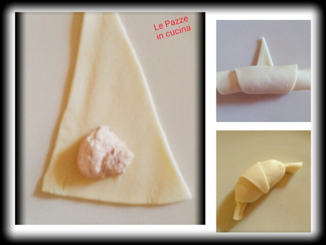 Srotolate la sfoglia e tagliatela in due metà. Tagliate una metà in 4 triangoli, l’altra in 8. Alla base di ogni triangolo mettete un pochino di prosciutto (se volete potete tritarlo) e arrotolate verso il vertice. Fate la stessa cosa con i wurstel e il tonno.
