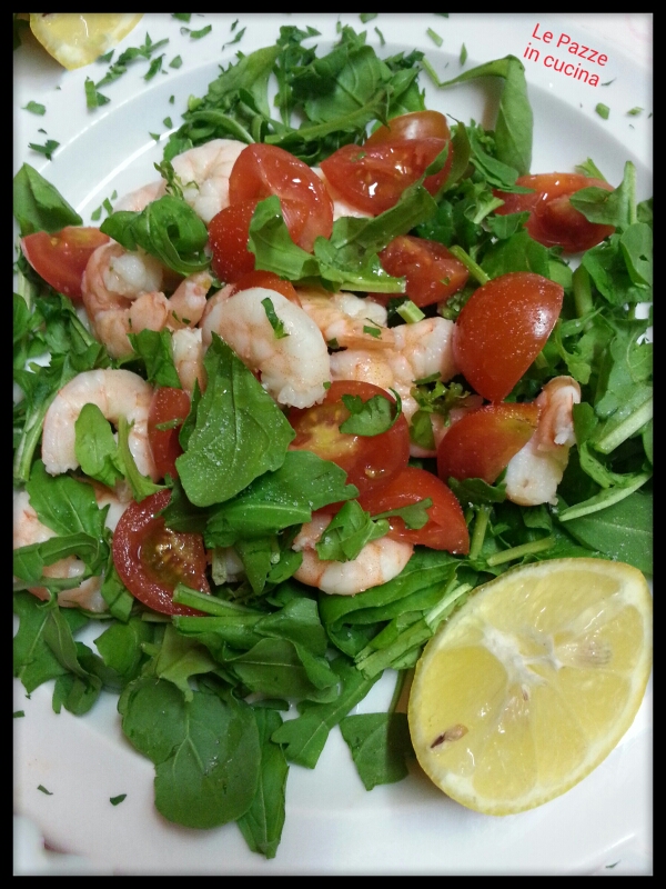 Fate cuocere i gamberi scongelati in acqua bollente, insaporita con alcune fettine di zenzero fresco, per circa 6 minuti. In questo modo i crostacei prenderanno un sapore limonoso durante la cottura. Nel frattempo lavate la rucola e i pomodorini e tagliateli a spicchi. Scolate i gamberi e uniteli alle verdure, condite con sale, pepe e succo di limone. Oplà, non abbiamo usato neanche l’olio!