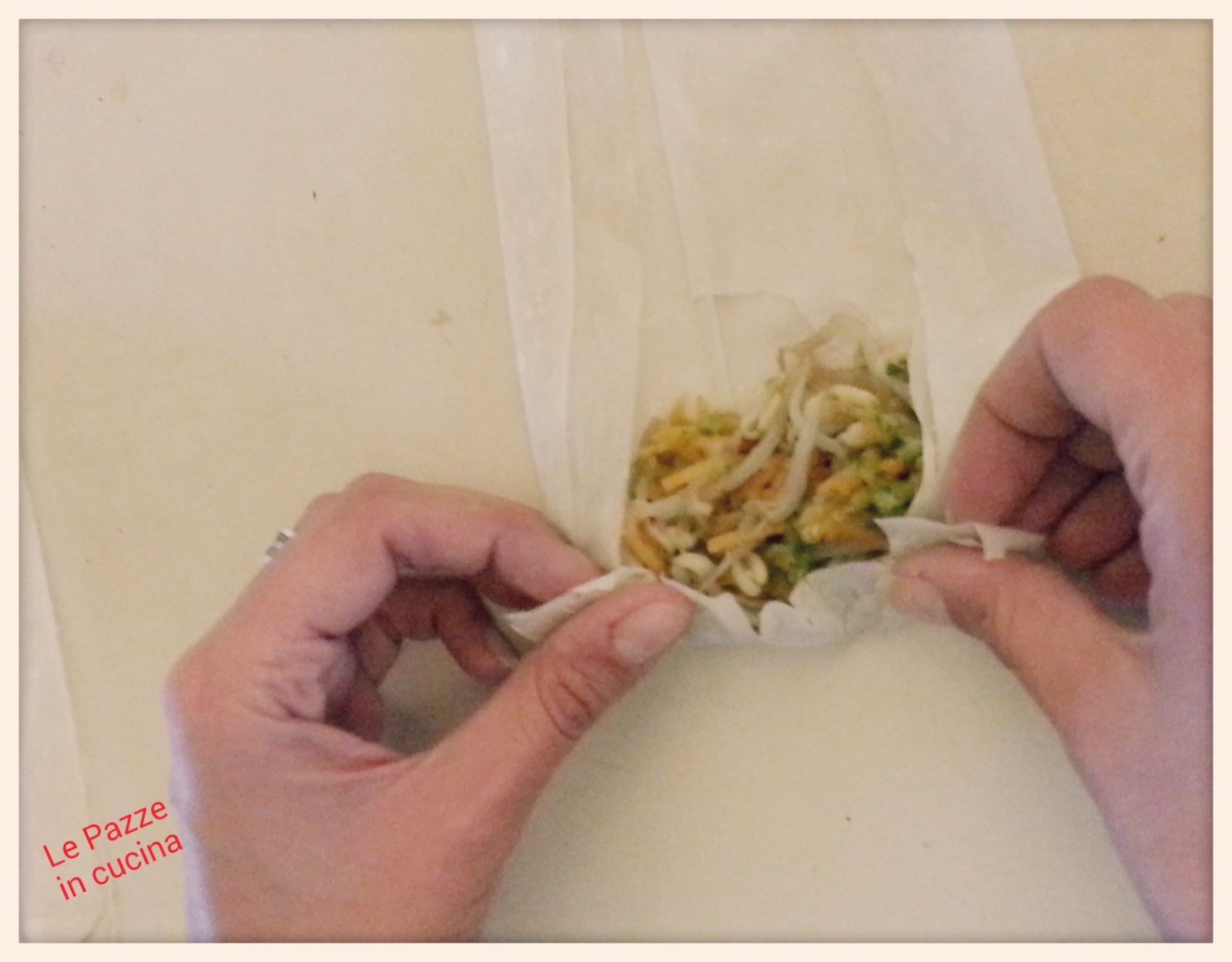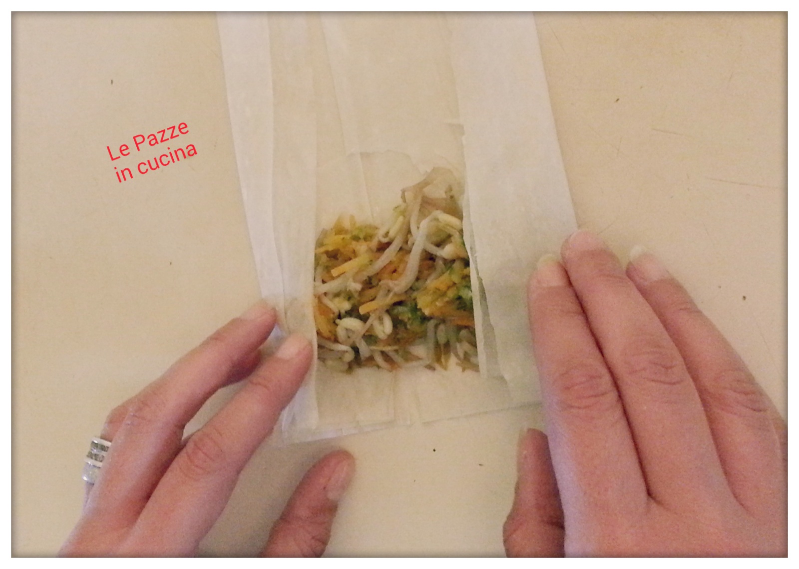 preparazione involtini primaveraChiudete prima i bordi laterali, poi sovrapponete la base e iniziate ad arrotolare, in modo tale che le verdure siano bloccate e non scappino dai lati!