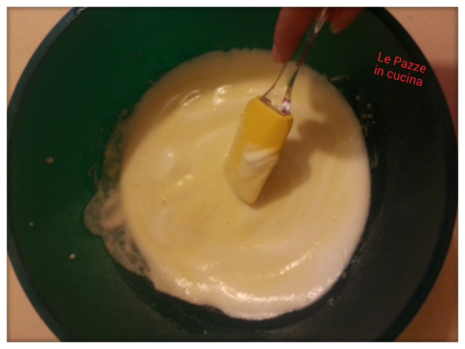 Montate l’albume con il pizzico di sale e lo zucchero, fino a ottenere una spuma morbida. Non deve diventare dura (come ad esempio quando si fa il pan di Spagna), perché si rischia di formare grumi. Aggiungetela quindi all’altro composto, mescolando delicatamente dal basso verso l’alto.