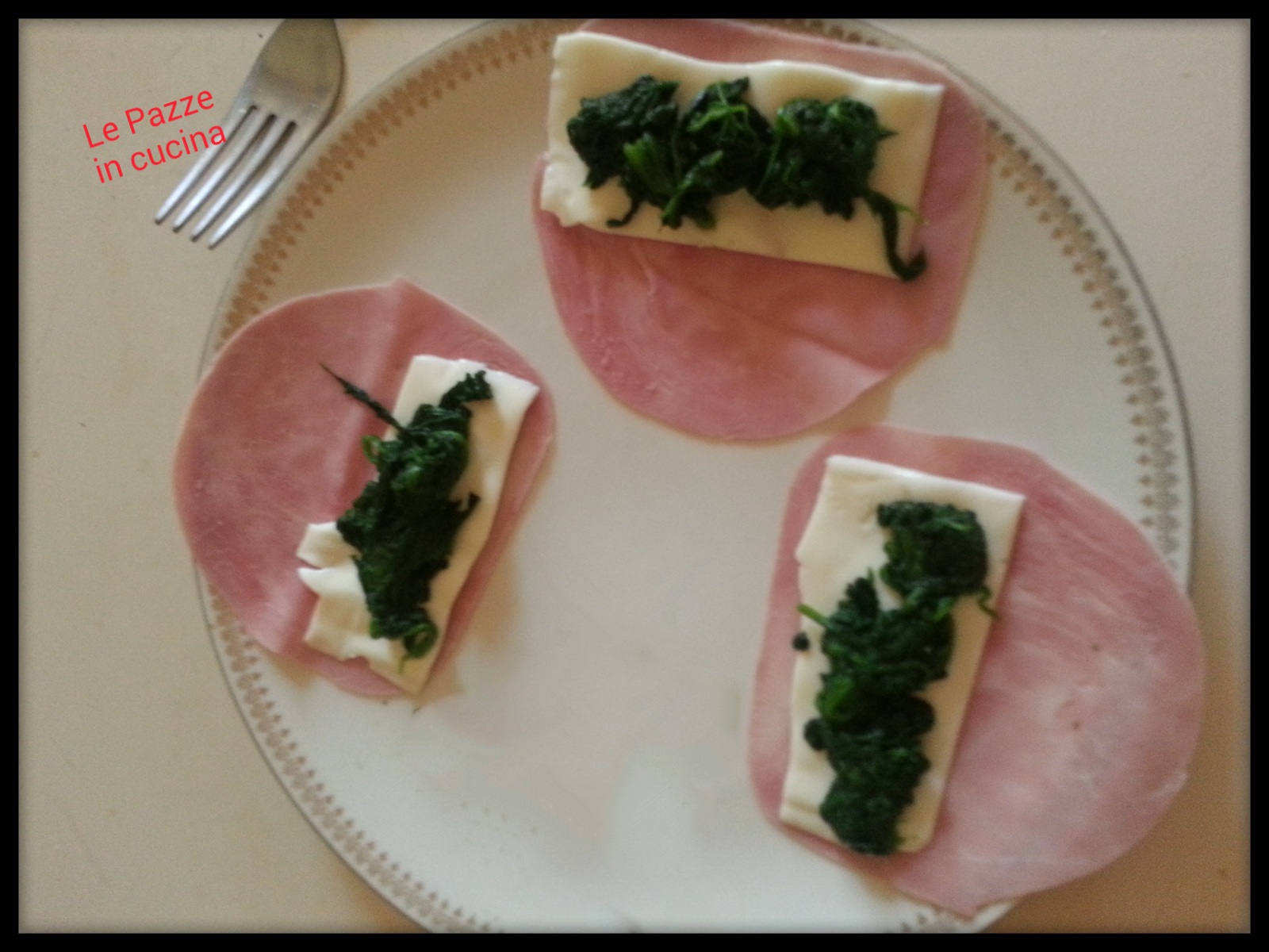 Aprite le fette di prosciutto e ponete al centro mezza fetta di formaggio e un pochino di spinaci che avrete fatto raffreddare. Noi abbiamo sbagliato a posizionarli, mettendoli sul bordo, il caldo ci ha dato alla testa (ahimé). L’unico problemino è stato nella chiusura, ma se metterete tutto al centro sarà più facile arrotolarli!