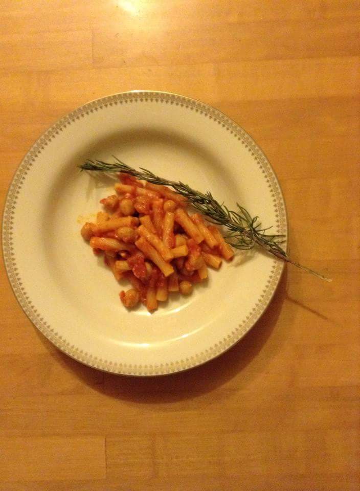 In una padella larga fate rosolare l’aglio, che poi toglierete, aggiungete i ceci e i pelati (o salsa di pomodoro), il sale q.b. e un po’ di peperoncino e procedere con la cottura per un sugo normale.
