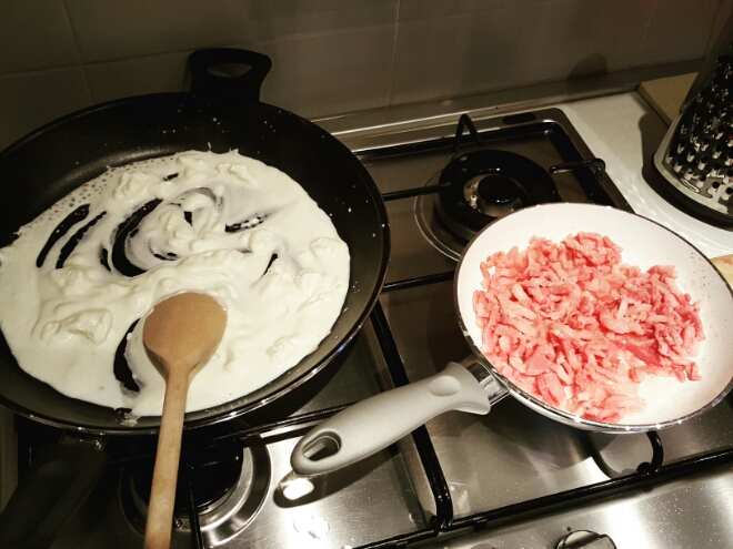 Fate scaldare una padella piccina e lanciate i cubetti di pancetta. Aggiungete la cipolla e continuate a cuocere. La pancetta rilascerà il suo grassino, rosolandosi e abbrustolendosi. Quando sarà quasi pronta, cioè croccantina, versate l’aceto per sgrassare e fate evaporare. Spegnete il fuoco e togliete i cubetti dalla padella, così rimarranno ben croccanti senza grasso.