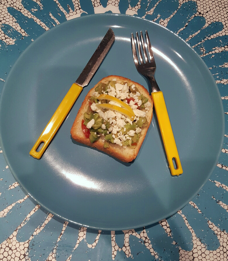 A questo punto scaldate una padella o una piastra per tostare il pane. Una volta pronto, stendete un bello strato di crema di avocado e sopra sbriciolateci la feta, quantità a piacere! Decorate con due fettine di buccia di limone e azzannate ancora caldo! 😉