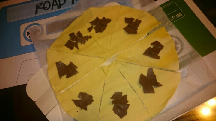 Aprite il rotolo di pasta sfoglia e ritagliate 8 triangoli con una rotella e disponete al centro il cioccolato a pezzi.