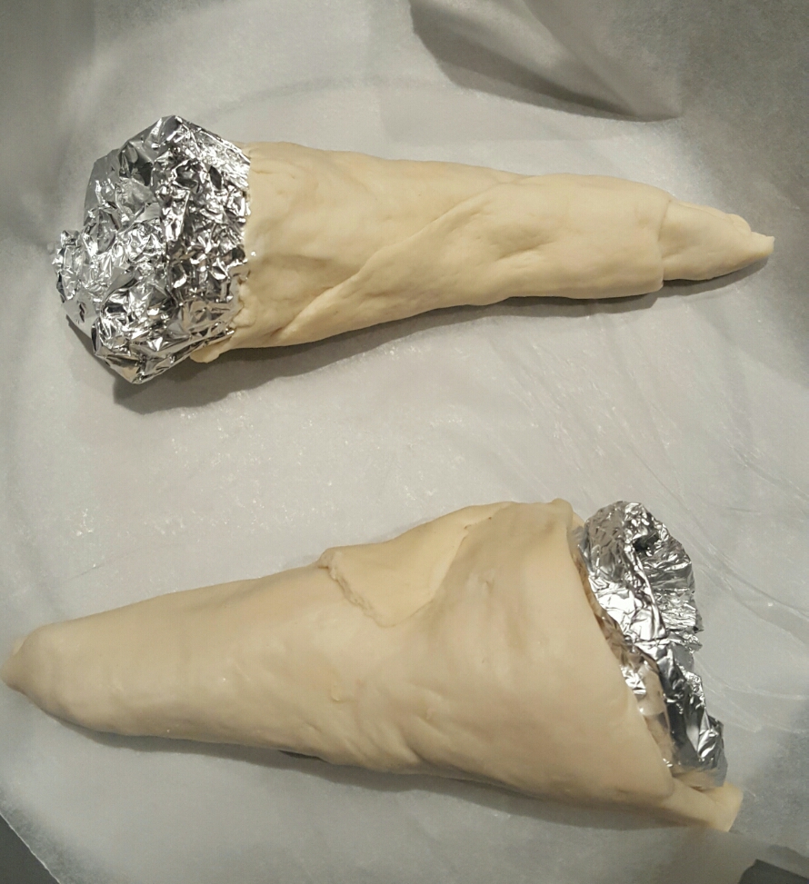 A questo punto, prendete il rotolo di pasta pizza e tagliatelo in 4 (o in 8 se volete coni più piccoli) e arrotolate la pasta sui coni.