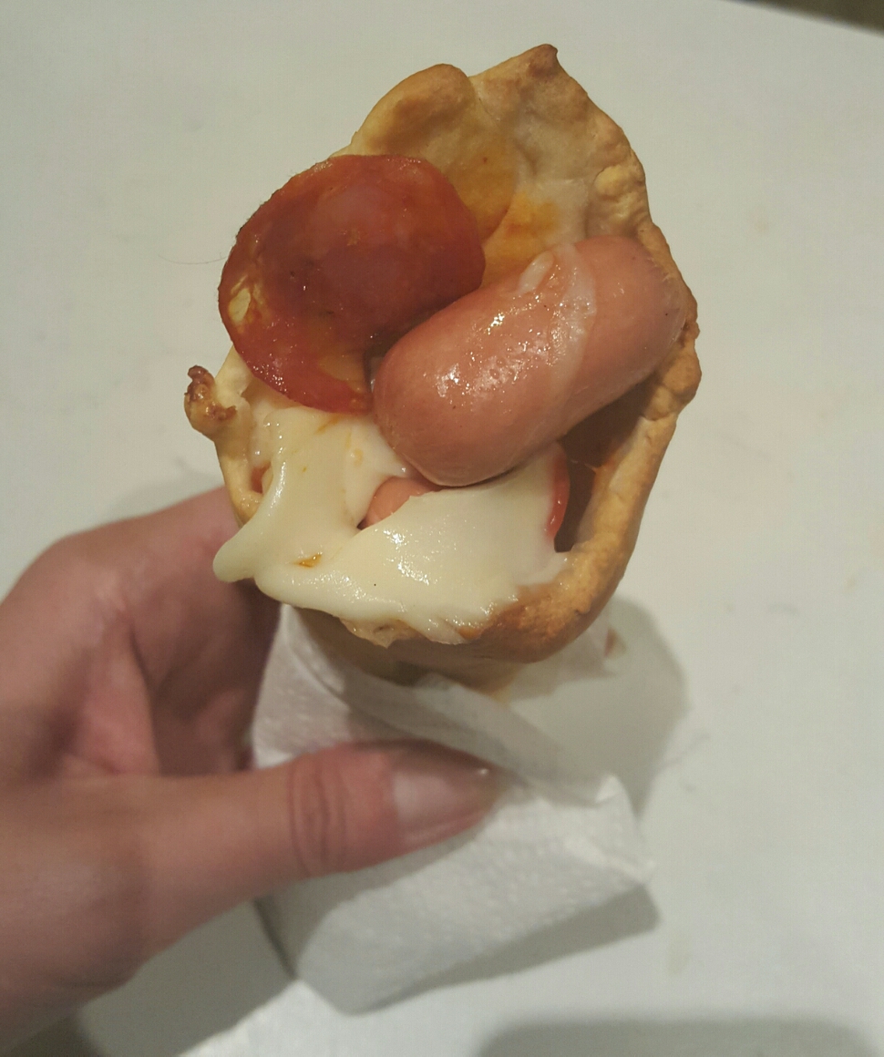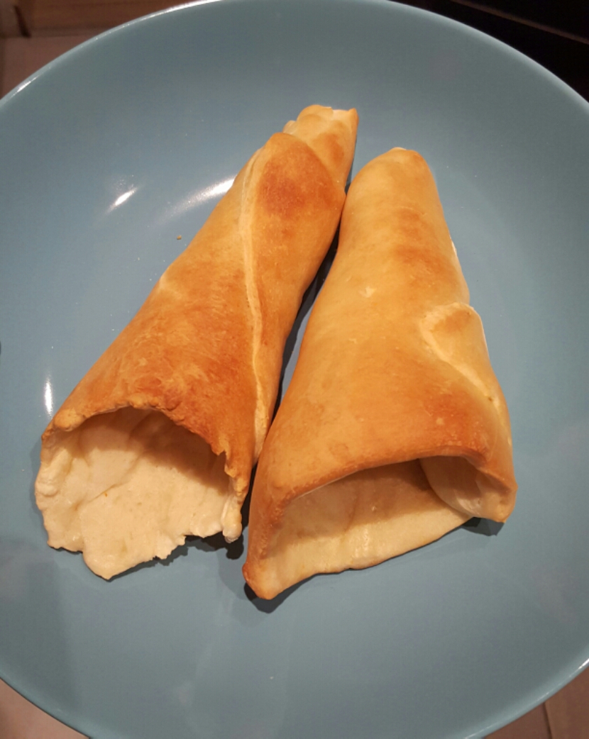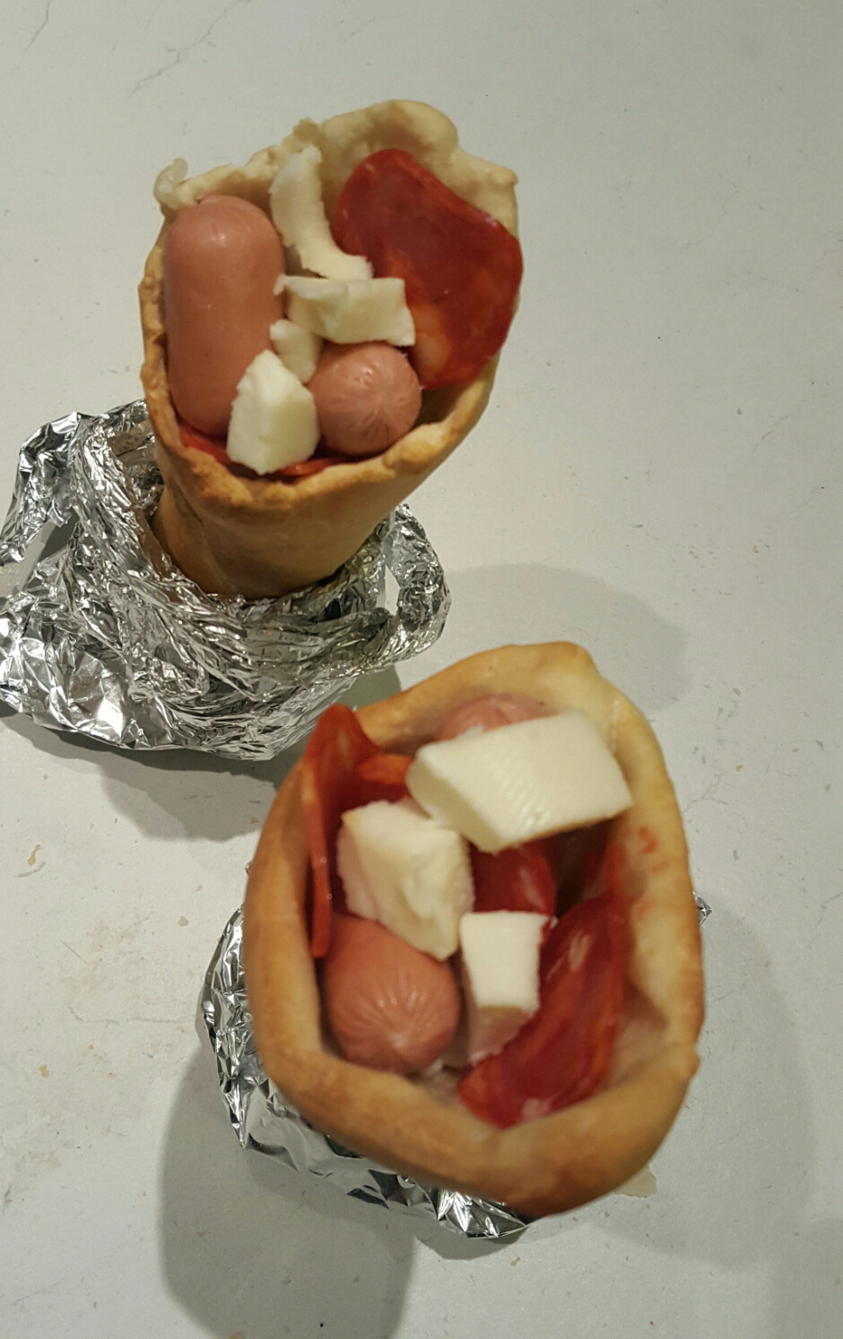 La seconda ricetta realizzata con la pasta della pizza sono questi favolosi coni, ripieni poi con mozzarella, salamino e wurstel.