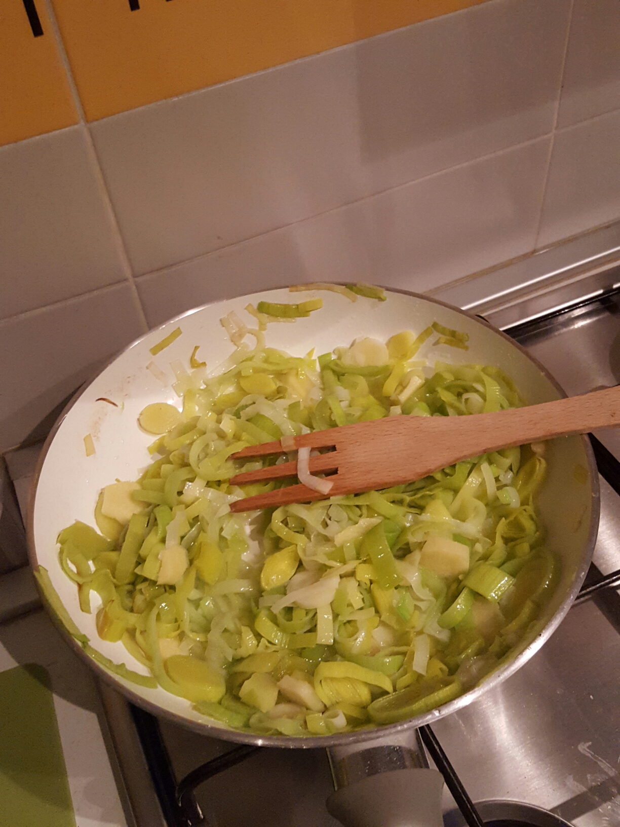 Pulite e lavate i porri, affettateli a rondelle e buttateli in una padella dove avrete fatto scaldare un filo d’olio. Aggiungete un po’ di sale e fateli rosolare bene. Allungate con una tazzina d’acqua, coprite e fate stufare per 5 minuti. Quando saranno morbidi, aggiungete lo zenzero a pezzetti e fate saltare.