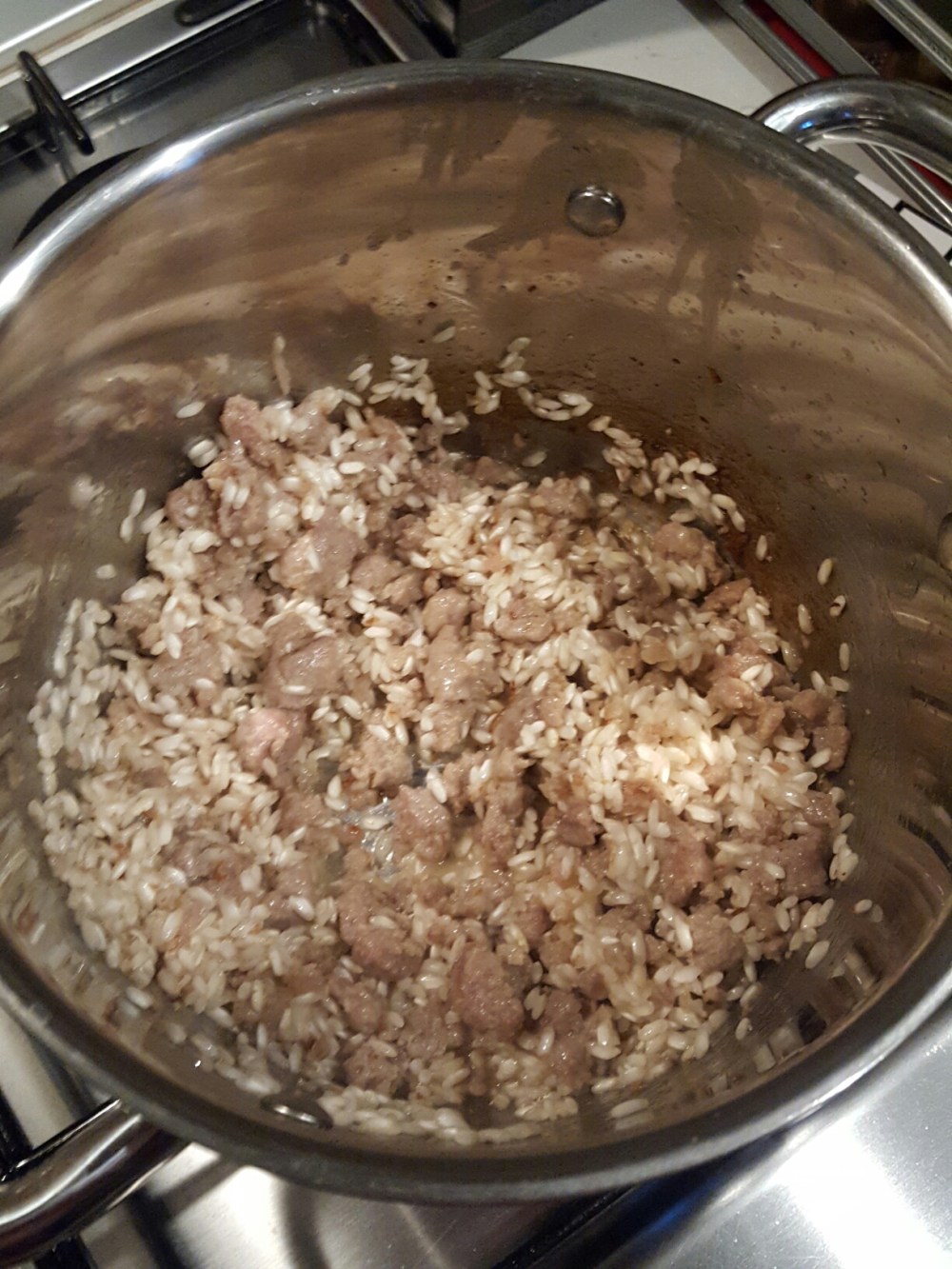 Una volta praticamente cotta, aggiungete il riso, fatelo tostare e sfumate tutto con un bicchiere di vino bianco.