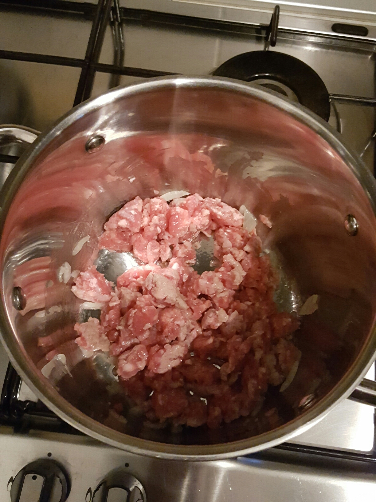 In una pentola fate scaldare un filo d’olio mentre affettate la cipolla a piccoli cubetti. Lanciatela poi nell’olio per farla imbiondire. A questo punto aggiungete la salsiccia a pezzetti e fatela rosolare ben bene.