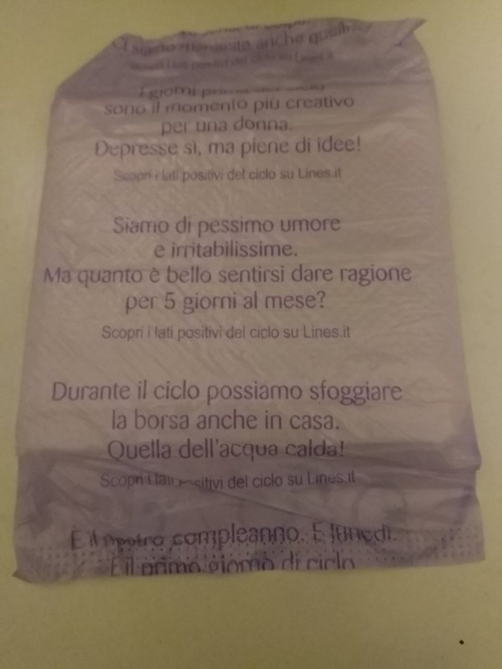 Una domanda. Perché avete rimesso le frasi sugli assorbenti? Chi le ha scritte? Un uomo che ci prende per i fondelli?