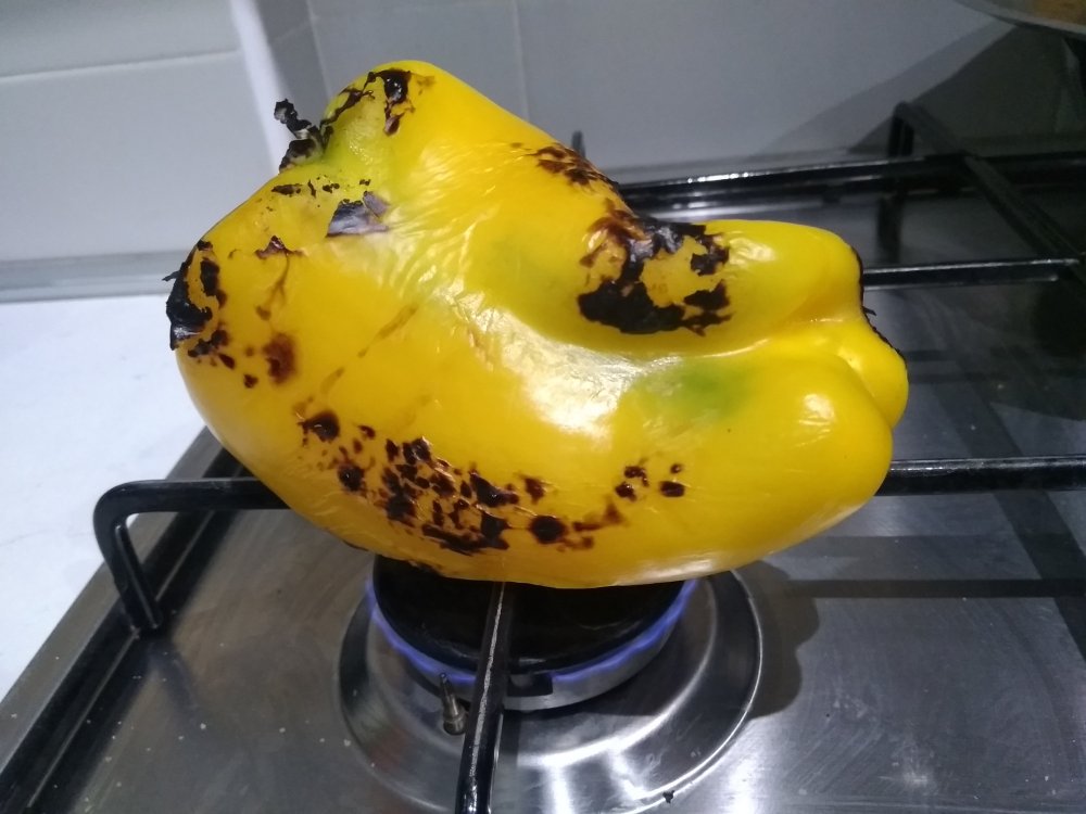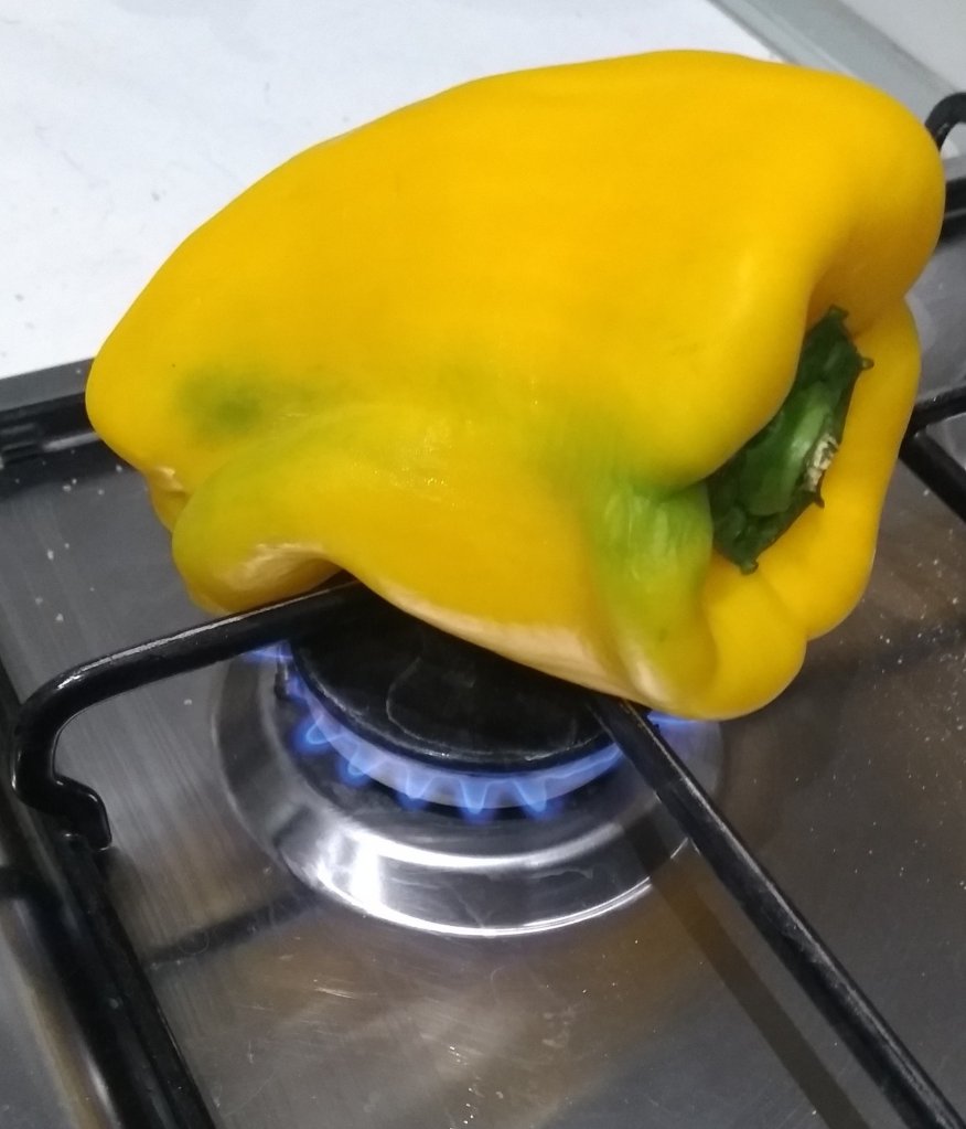 Lavate i peperoni interi, accendete il fornello del gas e posizionatelo su un lato. La fiamma non deve essere troppo alta, altrimenti si carbonizzano! Girate il peperone man mano con forchetta e coltello, mettendolo anche in verticale per farlo cuocere anche alle estremità. La pelle piano piano si abbrustolirà, iniziando a staccarsi.