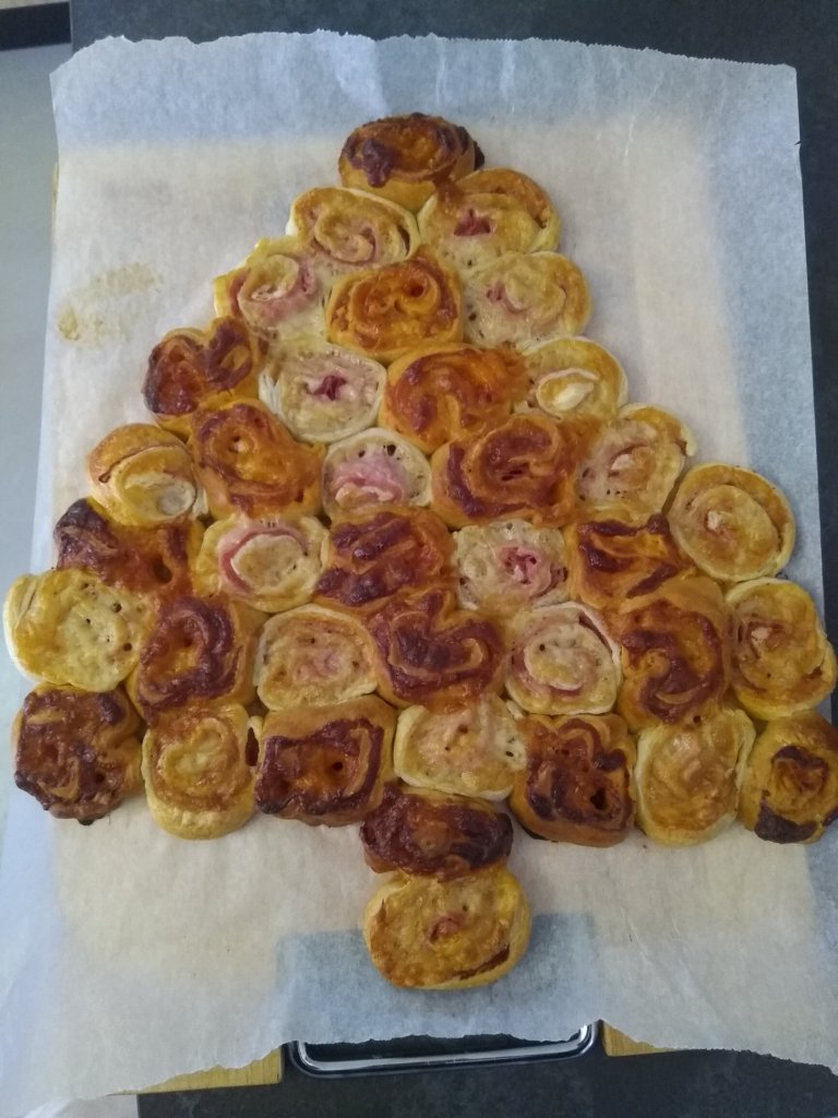Carta forno in una teglia e iniziate a formare l’albero, partendo dall’alto con una girella e aumentando di una man mano che scendete, disponendole vicine. Alla fine, formate il tronco con due girelle.