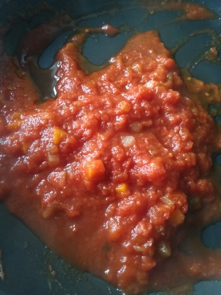 Prendete il soffritto, in quantità a piacere a seconda di quante verdure desiderate, fatele cuocere in una padella con un po’ di acqua – niente olio. Una volta soffritte, aggiungete la polpa di pomodoro e fate sobbollire per almeno mezz’ora, aggiungendo sale o dado.