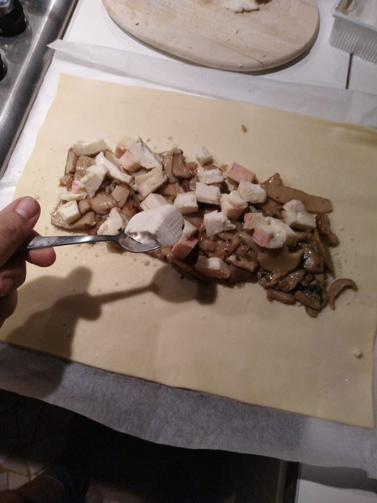 Stendete la sfoglia e posizionate funghi e taleggio al centro, lasciando tre centimetri liberi su ogni lato, per la chiusura.