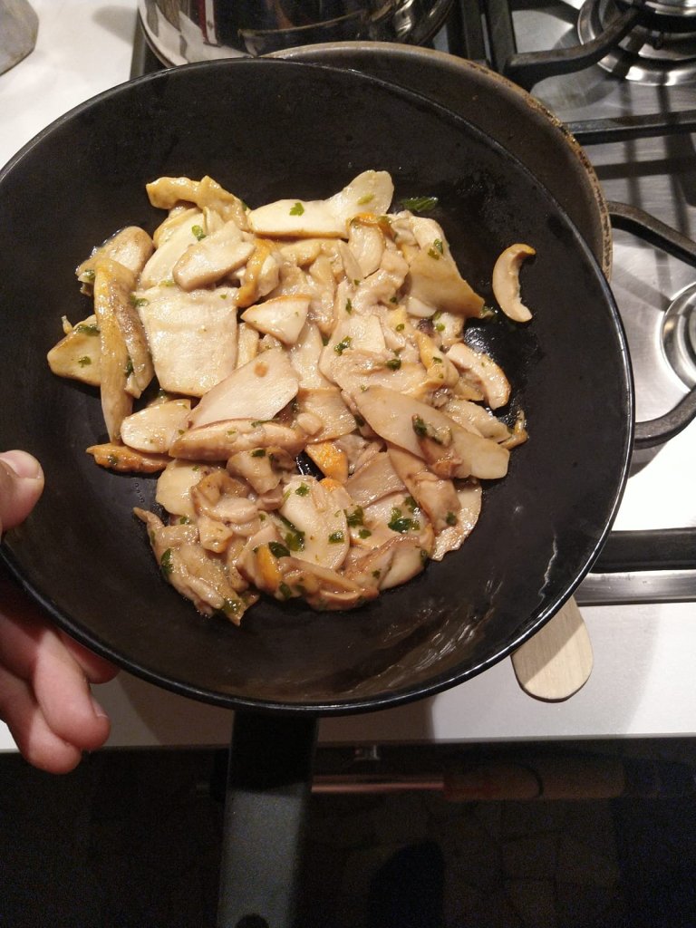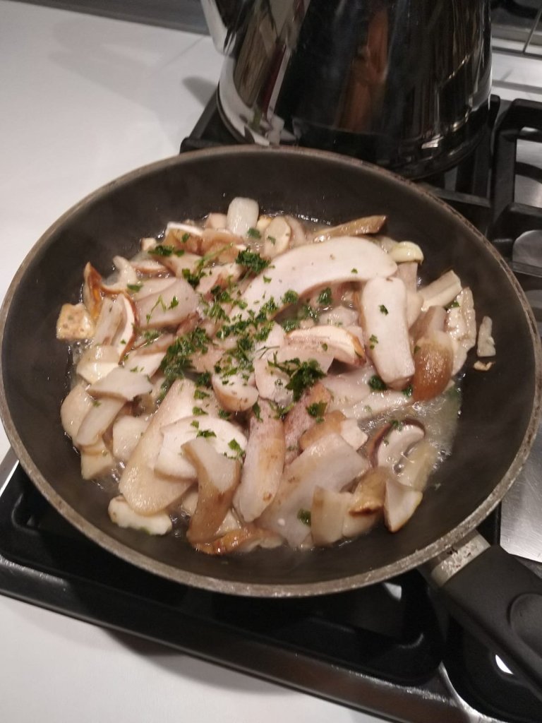 Mettete un po’ di olio in una padella e fate rosolare l’aglio. Aggiungete i funghi e fateli cuocere per una ventina di minuti, fino a quando la loro acqua sarà evaporata, aggiungete sale, pepe e prezzemolo. Nel frattempo tagliate anche il taleggio a quadretti.