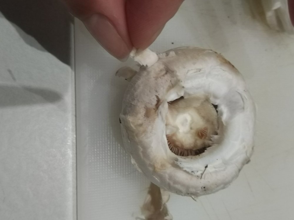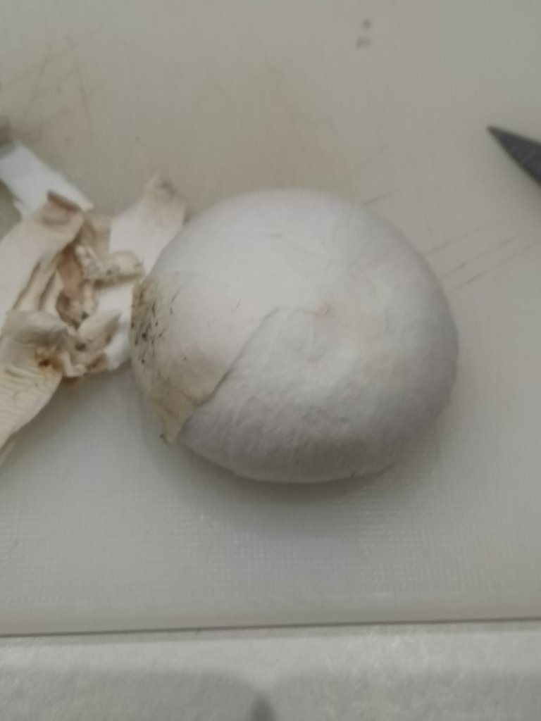 Ora dovremo eliminare quella sorta di “pellicola” che ricopre la cappella, in modo da togliere tutti i residui terrosi. Da sotto, pian piano, iniziate a sbucciare la pellicola, tirandola verso la parte centrale della testa. Si fa tutto con le mani, oppure potete utilizzare un piccolo coltello. Vedrete che verrà via molto facilmente e la cappella sarà bella bianca e pulita (se il fungo non è marcio).