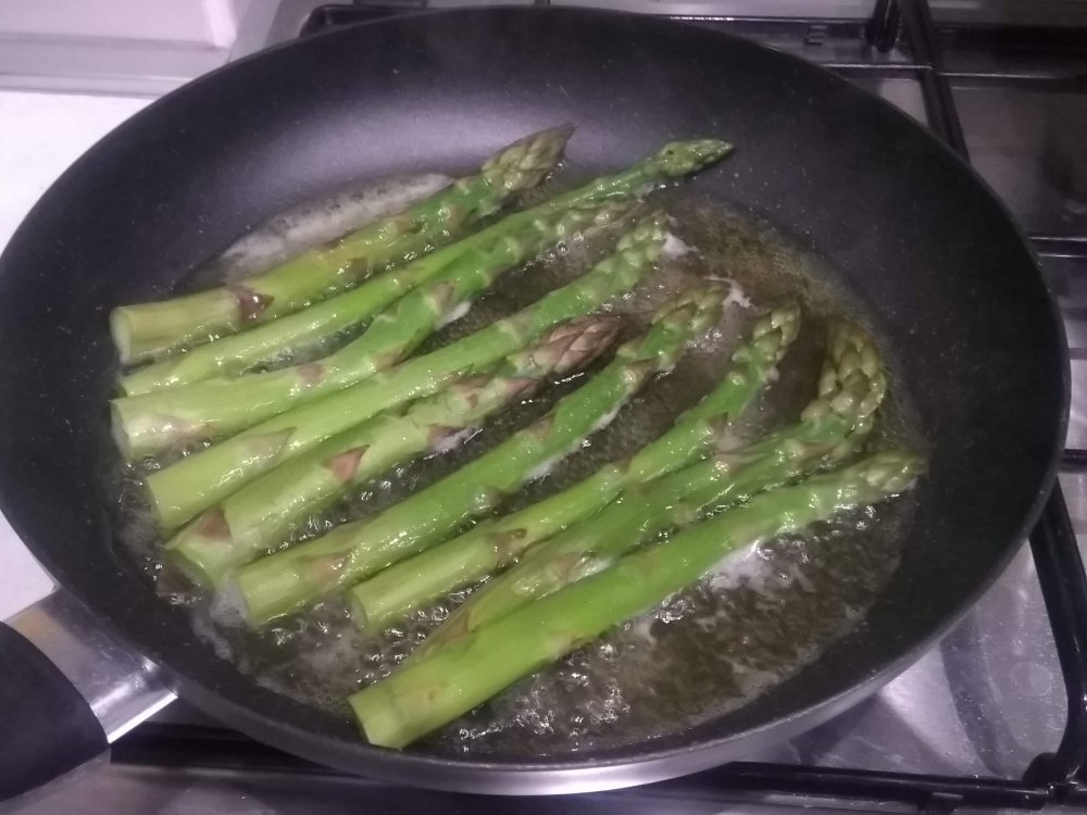 Mettete un dito d’acqua in una padella e fate sbollentare per cinque minuti gli asparagi che avrete pulito (via 3/4 cm di gambo) e lavato.