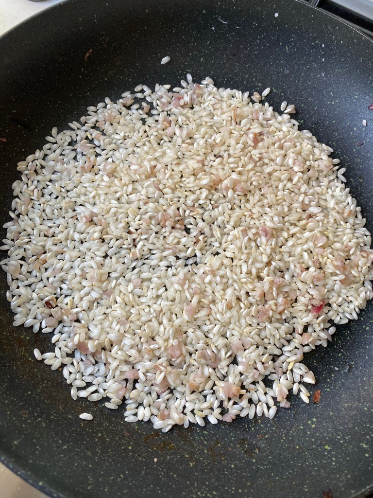 Fate sciogliere la noce di burro e aggiungete lo scalogno a pezzetti per farlo soffriggere. Quando sfrigola per bene, aggiungete il riso e fate tostate per un paio di minuti. Sfumate con il vino e fate evaporare.
