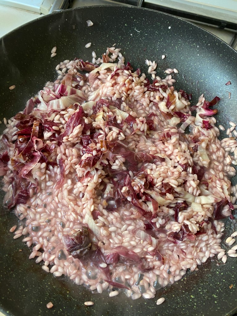 A proposito di brodo. Per l’altra ricetta avevo fatto saltare in padella del radicchio per “asciugarlo” prima di andare in forno. Quando cuoce, rilascia un po’ di sua acqua. Tenetela da parte da utilizzare come brodo per il risotto! 😉