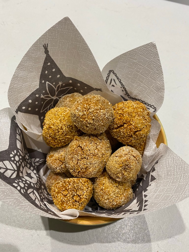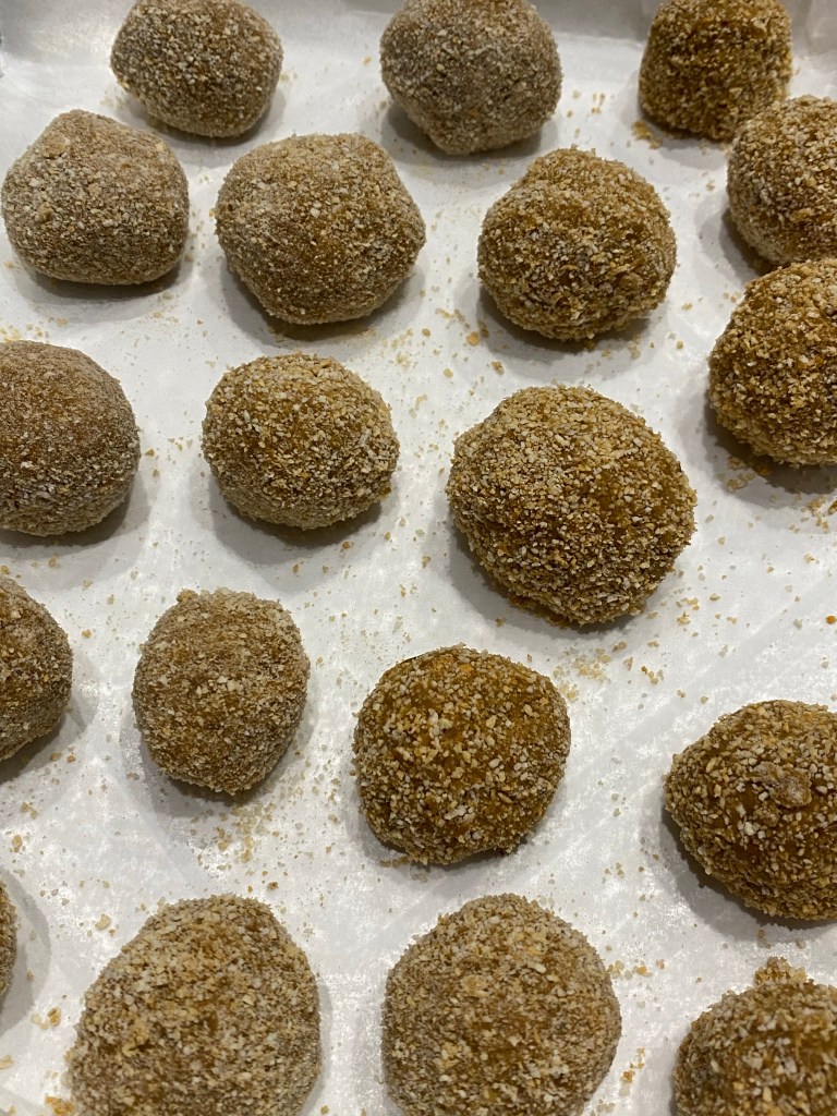 Ora formiamo le polpette, passiamole nel pangrattato e poi in una teglia foderata di carta forno. Un goccino di olio se volete (non è necessario) e via in forno a 180 per 35 minuti.