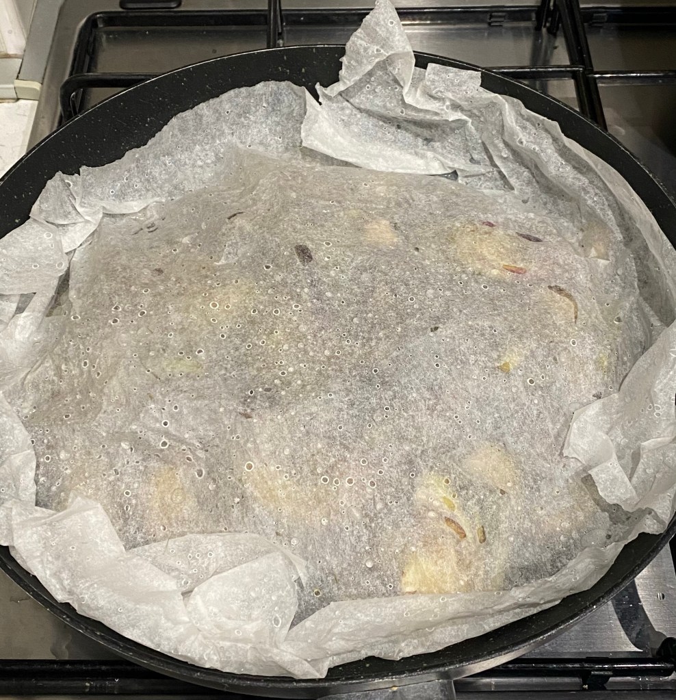 Di solito io li faccio in pentola a pressione, ma questa volta era già occupata. Per farli restare morbidi, ma cotti bene, ho usato il metodo della carta forno. Aggiungete una tazza d’acqua ai carciofi, bagnate il foglio di carta forno e ricoprite la padella, cercando di far aderire il più possibile la superficie, affinché si sviluppi vapore e i carciofi cuociano bene. È più facile a farsi che a dirsi!